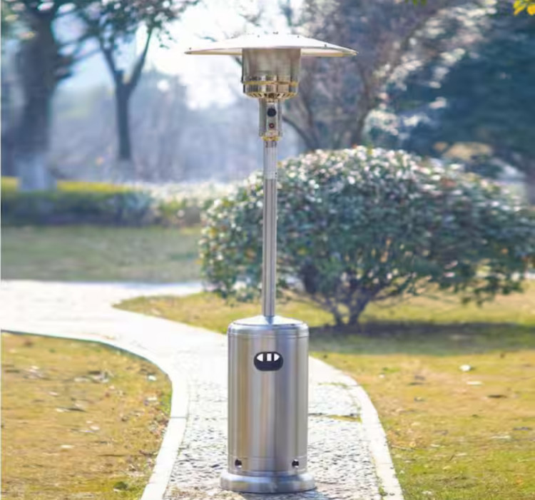A freestanding patio heater that brings steady, radiant warmth to outdoor gatherings — perfect for extending evenings on a deck, patio, or in a tented area. This stainless-steel-style tower heater features a wide heat-reflecting canopy, a tall central post for good coverage, and a weighted base that hides the fuel source and keeps the unit stable. Simple controls near the burner allow quick ignition and flame adjustment, while the elevated design throws heat downward and outward to keep guests comfortable without crowding the flame. Easy to place and remove for rentals, it’s ideal for restaurants, backyard parties, weddings, and any outdoor event that needs reliable, directional heat.